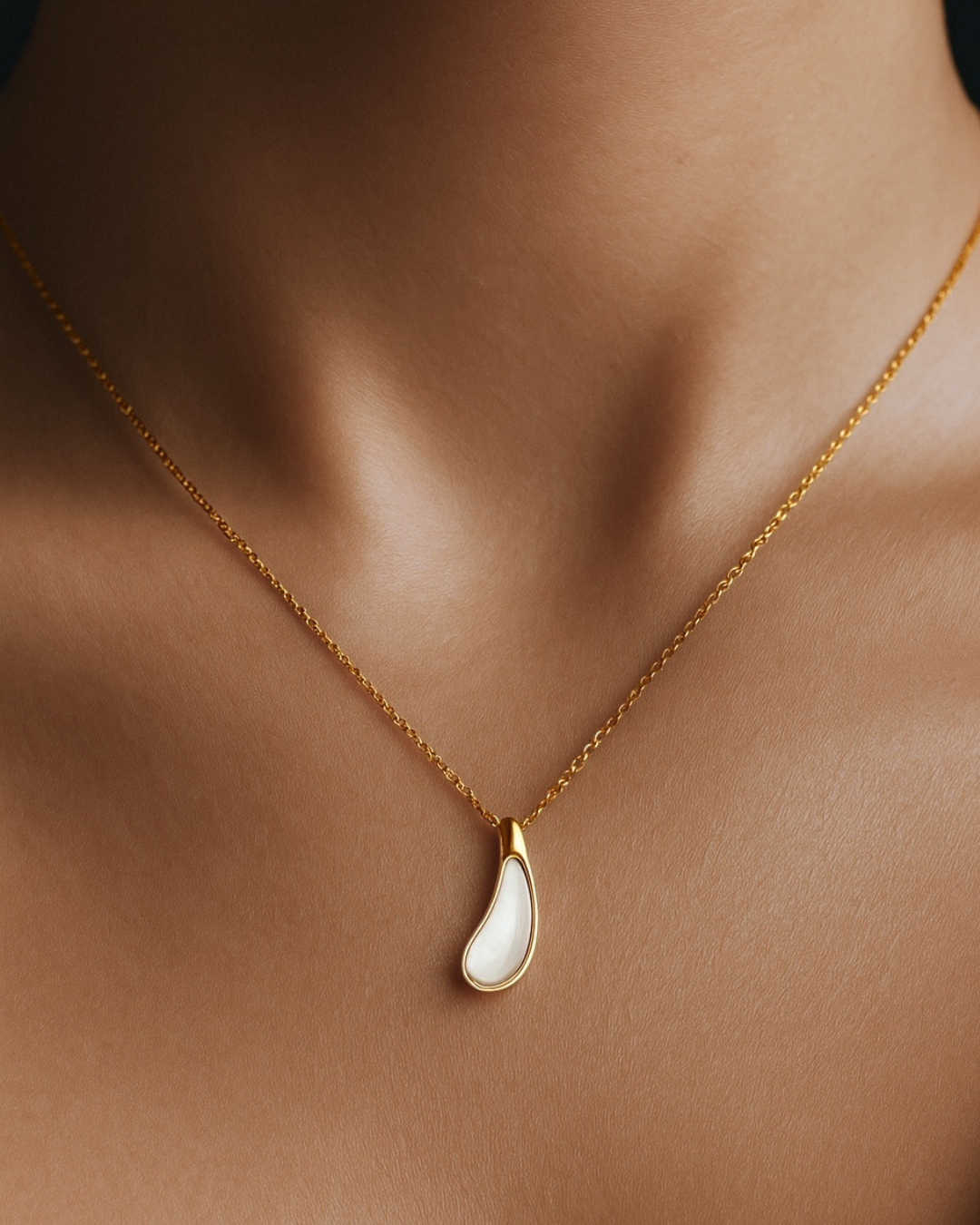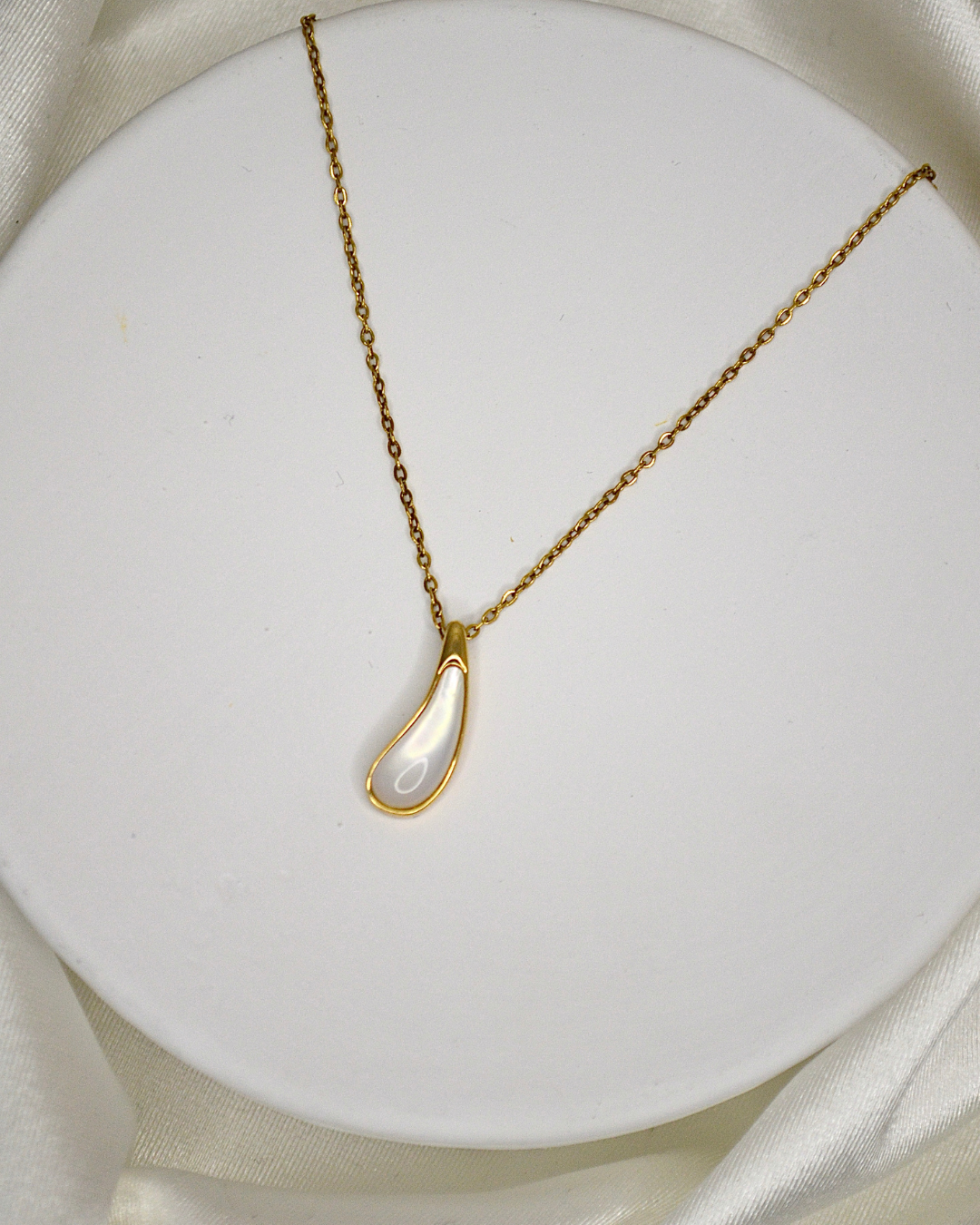 Elegancia y delicadeza se encuentran en Lagrima de Luna que destaca por su colgante alargado en forma de gota con acabado translúcido suspendido sobre una fina cadena dorada. Es ideal para quienes valoran los detalles discretos ya que añade un toque sutil de encanto a cualquier ocasión.