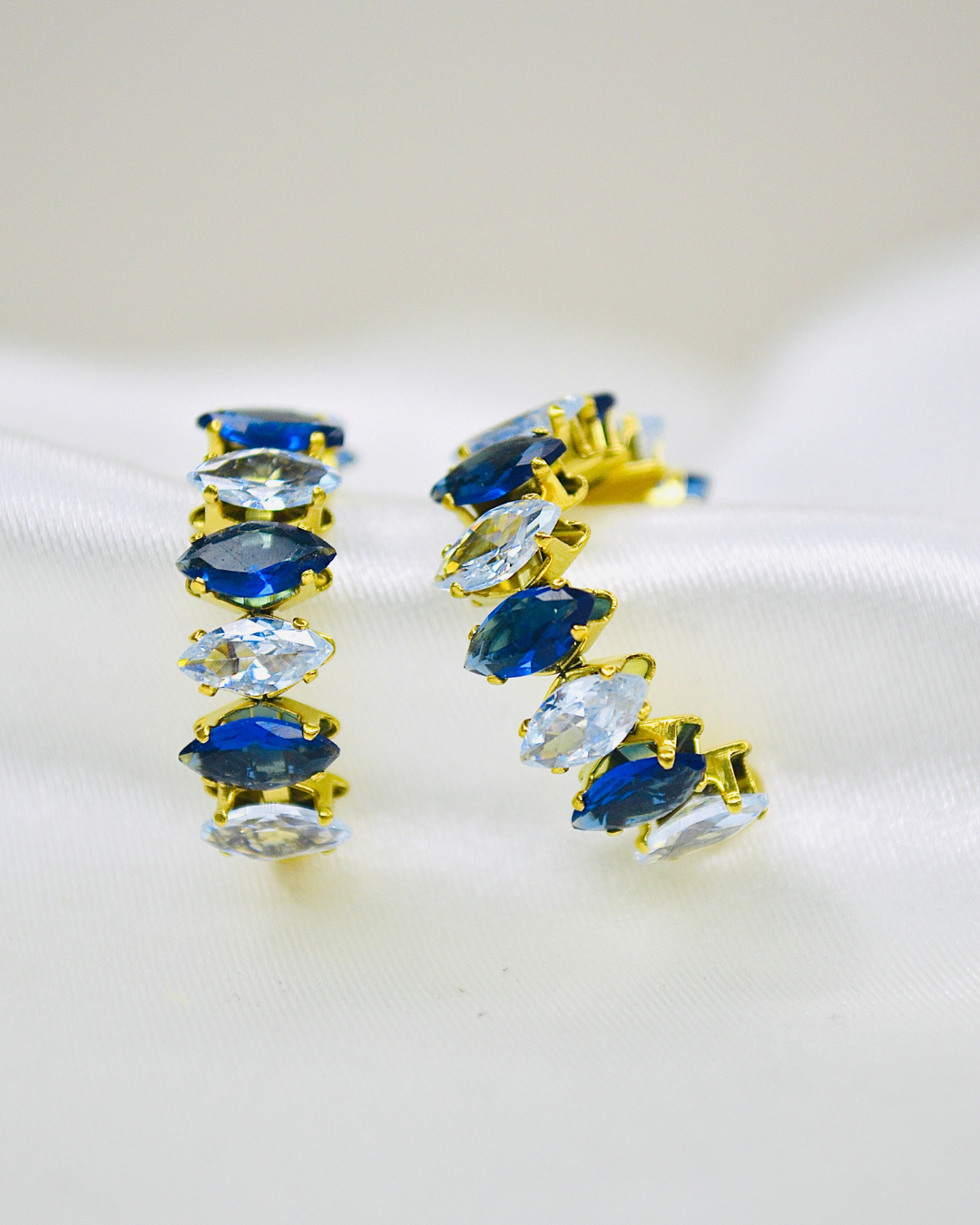 Cada piedra en forma marquise refleja la luz con un brillo cristalino que transmite pureza y distinción. El aro dorado abraza las gemas dando vida a un diseño que equilibra lujo y modernidad.